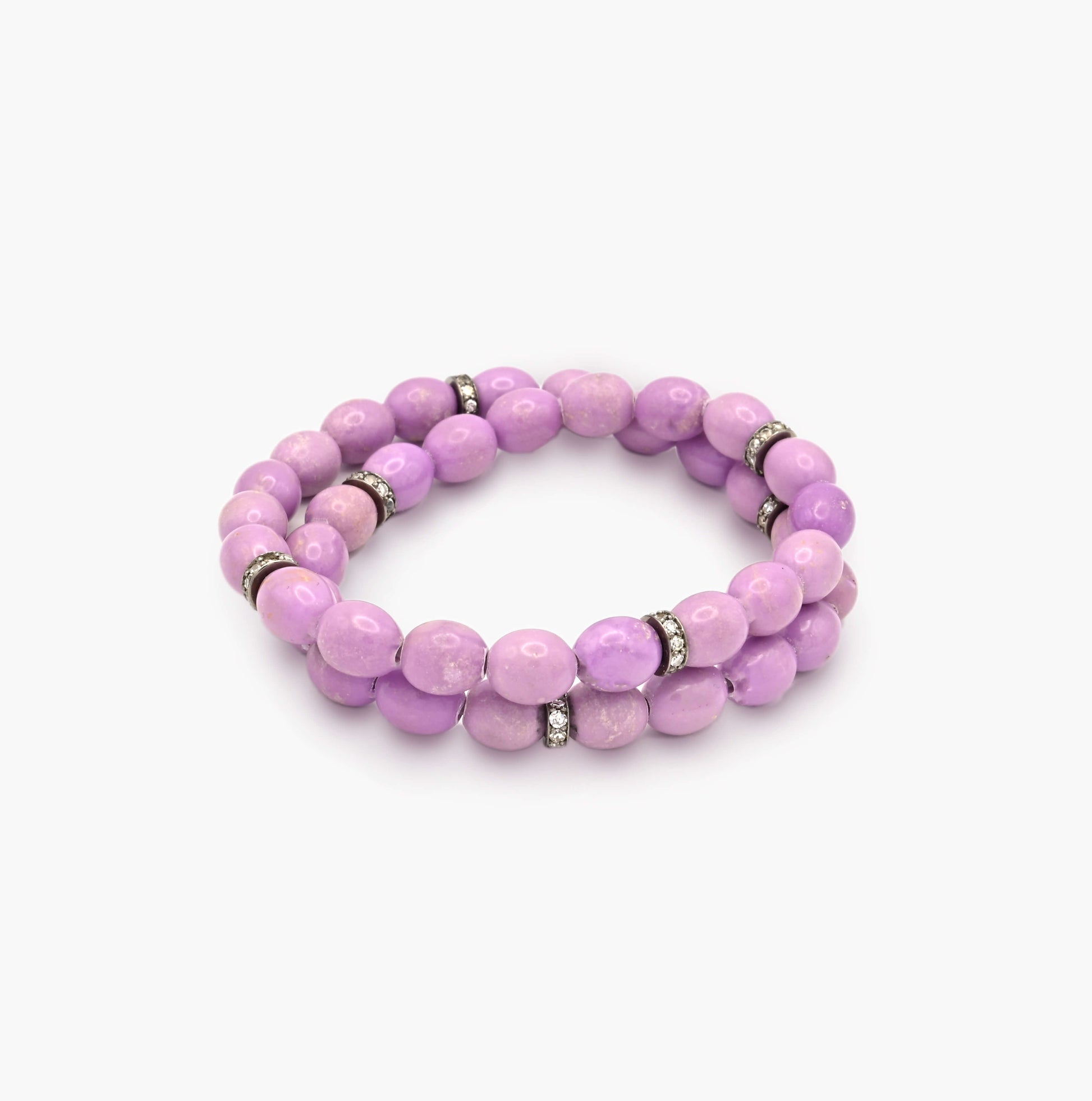This exquisite phosphosiderite bracelet combines sophisticated design with the finest craftsmanship. The soft purple-brown tones of the phosphosiderite beads harmonize perfectly with the delicate silver rollers adorned with sparkling diamonds. The double wrap creates a modern, casual look, making this bracelet a stylish companion for any occasion.