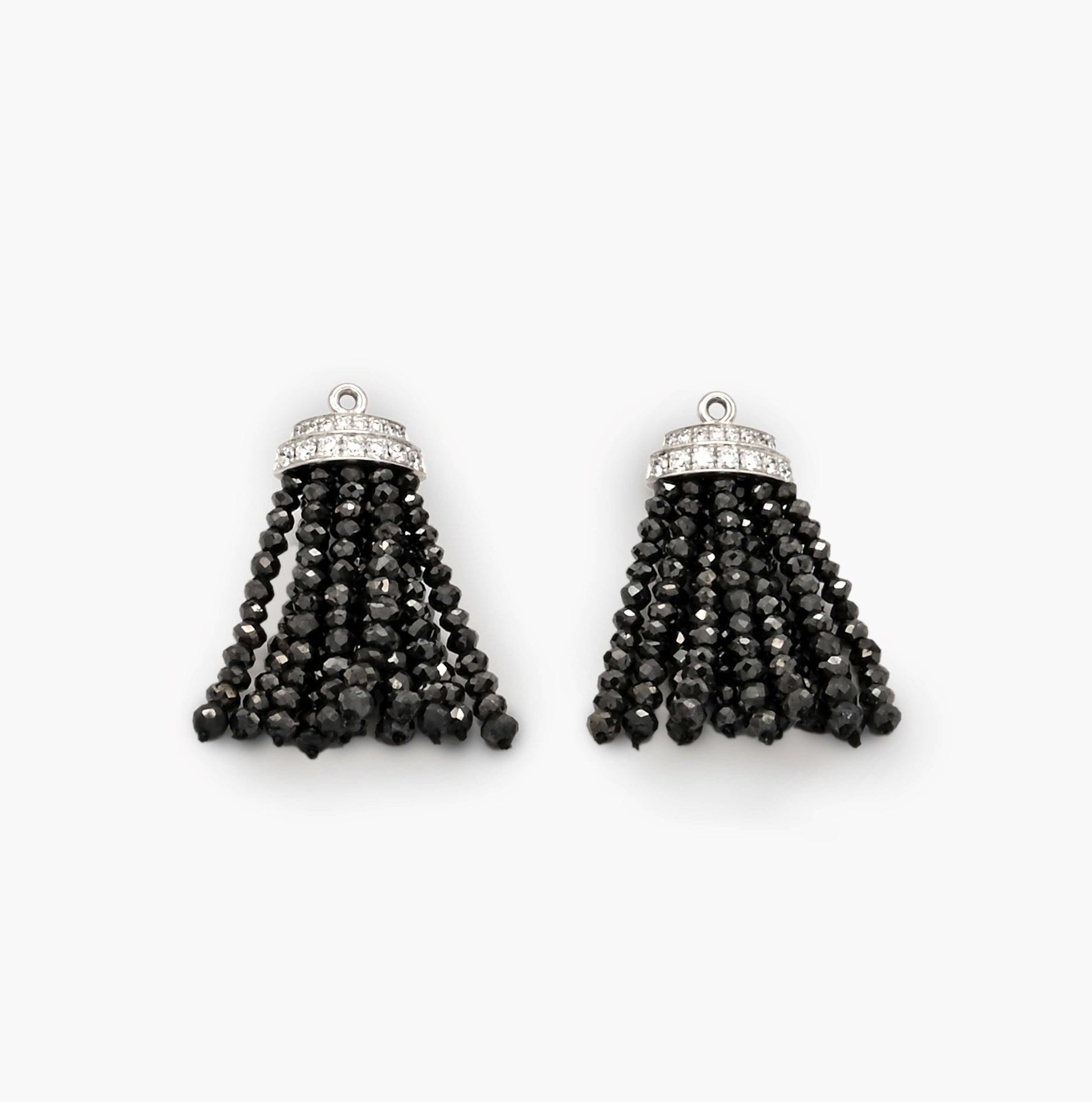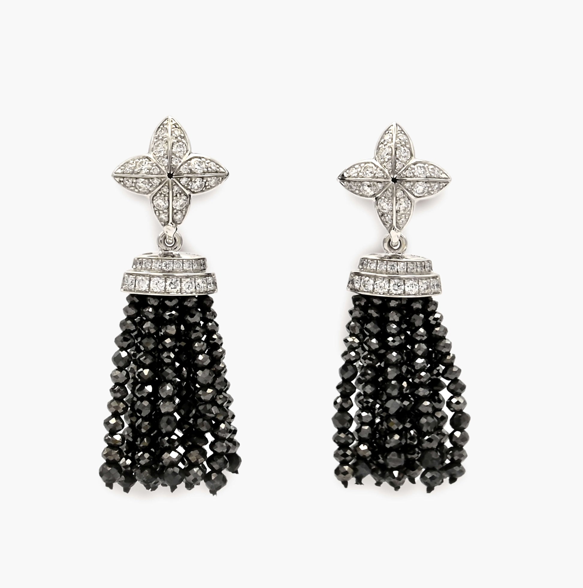 Jeder Zottel besteht aus 12 feinen Rängen schwarzer Diamanten, die bei jeder Bewegung geheimnisvoll funkeln und ein faszinierendes Lichtspiel erzeugen. Der obere Abschluss ist im Brilliantrand gefasst und mit 30 funkelnden Brillanten (0.23ct TW/Si) veredelt – ein kunstvolles Zusammenspiel aus hellem Glanz und dunkler Tiefe.