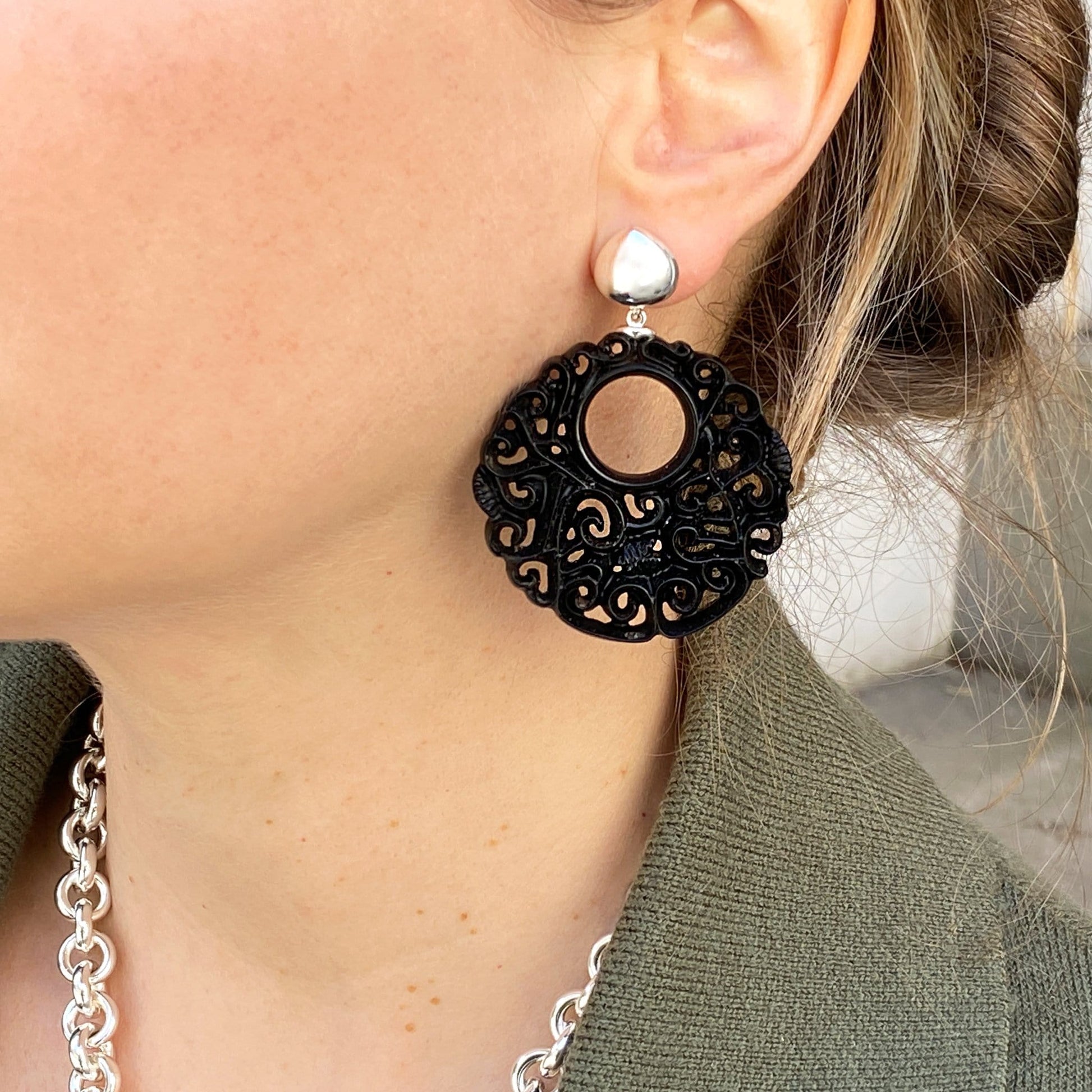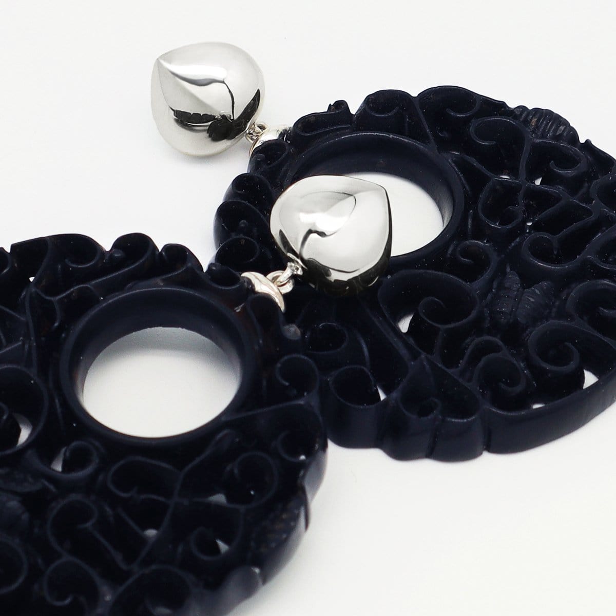 Die sorgfältig von Hand geschnitzten Jet Hänger sind einzigartig! Der fest verankerte Tropfenstecker rundet die Schönheit dieses Ohrschmuckes perfekt ab.
